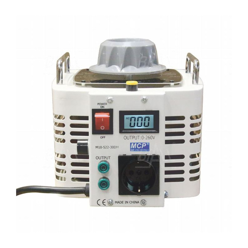 Autotransformatory M10-522LCD wyposażone są w przewód zasilający na wejściu, a na wyjściu w gniazda bananowe bezpieczne 4mm (oprócz M10-522-50LCD - tu zaciski laboratoryjne) oraz gniazda sieciowe (dostępne tylko w modelach M10-522-10LCD, M10-522-20LCD, M10-522-30LCD), dodatkowo każdy autotransformator posiada gniazdo uziemienia na obudowie.